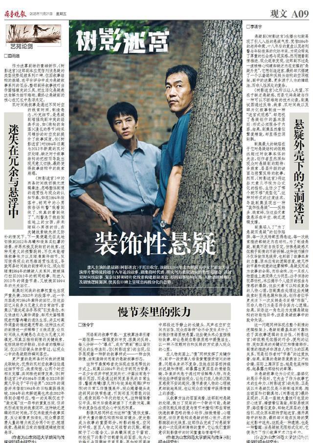 影像风格同样在为这种“慢”提供支撑。剧中大量的静态构图和延宕镜头,使光影成为叙事的重要部分。树影的摇曳,空间的呼吸,甚至人物之间短暂的沉默,都被赋予了心理含义。当冉曦深夜立于窗前,树枝投下的影子切割着他的面容,他内心的挣扎与阴翳被无声显影。再如校园甬道中那段近乎静止的长镜头,风声在空旷空间内回荡,观众在等待“会不会发生点什么”的微妙情绪里被悬置。这些镜头未必直接推动故事,却让悬疑在影像质感中缓慢滋生,以一种不依赖对白和反转的方式渗入观众的心里。 在人物刻画上,“慢”同样发挥了关键作用。剧中一段受害人母亲黄慧接受询问的场景,问题本身并不复杂,但她在回答前持续的迟疑和停顿,却暴露出更深层的情绪裂缝。导演并未急于通过对话解释人物,而是将这些停顿留给观众,让他们在人物的沉默里感受不安的起伏。慢节奏使人物的心理被更细致地展现,也让观众在观看中获得情绪上的渗透。 从叙事方法的层面来看,这部剧对悬疑的处理,提出了观剧的一个新的可能,悬疑必须依赖反转密度与情节冲撞吗?那些常被快速叙事忽略的微小动作、细微情绪、心理暗流,往往更能构成悬疑的核心张力。在树影斑驳的光线里,这部作品完成了对悬疑审美的一次低调却清晰的重申,它让我们重新意识到影像中的时间重量与情绪呼吸。 (作者为山东师范大学新闻与传媒学院硕士研究生) 迷失在冗余与悬浮中 文|田雨璐 作为迷雾剧场的重磅新作,《树影迷宫》这部剧本应凭借刑侦悬疑的类型优势延续系列口碑,但因叙事结构的崩塌,在平台评分中成为悬疑叙事系列的低谷。整部剧将叙事技巧当作篇幅填充的工具,把生活化悬疑表达曲解为细节堆砌,最终让悬疑剧的核心在冗长中悬浮未定。 双时间线叙事是通过不同时空的线索对照,制造悬念、补充细节,是悬疑剧增强戏剧冲突的经典手法,如《隐秘的角落》《漫长的季节》均采用精妙的时空交织提升了叙事深度。但《树影迷宫》对1994年旧案与2012年新案的双时空处理,缺乏对于叙事结构的把控而导致出现无意义切换,最终使得叙事结构中的线索崩塌。 《树影迷宫》中的两条时间线切换无逻辑章法,忽略整体剧情的连贯性与观众的认知节奏。如在1994年段落中,胡同中的小男孩告诉刑警“我看到他了,我真的看到他了”,刑警急于救助倒在地上的女孩,并未理睬小男孩的话,在关键线索缺失并无弥补的情况下,下一集便毫无征兆地切换到2012年冉曦和徒弟买红薯的场景,并再未提及跳转前的线索。这种无意义的频繁跳转,不仅未能增强叙事张力以及理清案件细节,反而使得观众的思维连贯性混乱,导致两条时间线的剧情碎片化,观众刚理清1994年的嫌疑人关系网,就被强行拉回2012年的胡同琐事,刚进入2012年的调查节奏,又被拽回1994年的无关回忆。