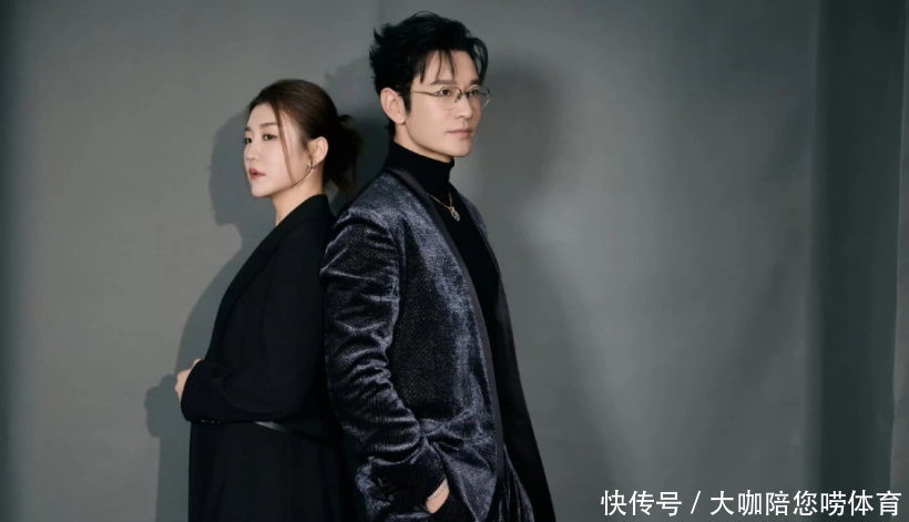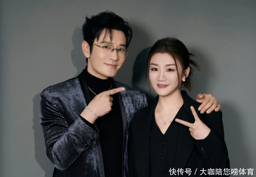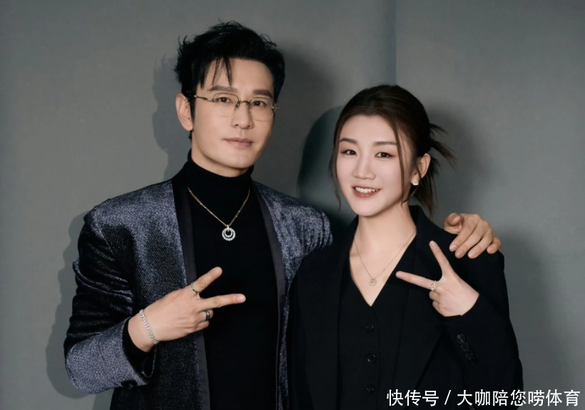 其中一张照片上,黄晓明带着一副银边眼镜,穿着黑色的打底衫,外面是一套银灰色的西装。他左手搭在陈梦的左肩,右手做出胜利的手势。而陈梦把头发盘在脑后。穿着一套黑色的职业套装。
