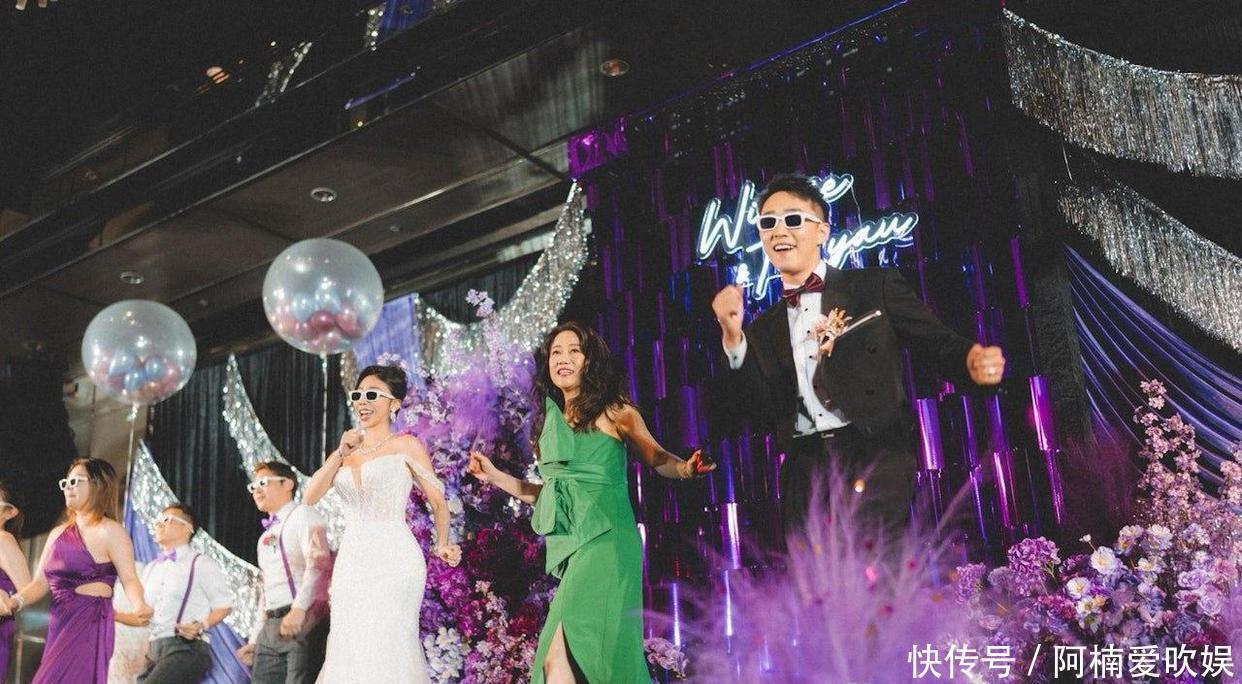 证婚仪式结束后,接下来就是举办晚宴啦。容天佑在香港丽思卡尔顿酒店的Damond Ballroom设席,喝了23桌,场面也是相当豪华盛大。晚宴时,他再次换了一套礼服,从之前的白色变成了黑色,登场时还带着一帮伴郎,一边戴着墨镜,一边用劲歌热舞的方式亮相。新娘也换了另一套深V设计的婚纱,剪裁得恰到好处,展现出迷人的身段。两人带着伴郎伴娘,一边唱歌一边跳舞,热闹非凡。除了亲友以外,还有不少圈里的明星到场送上祝福,气氛简直嗨爆了。